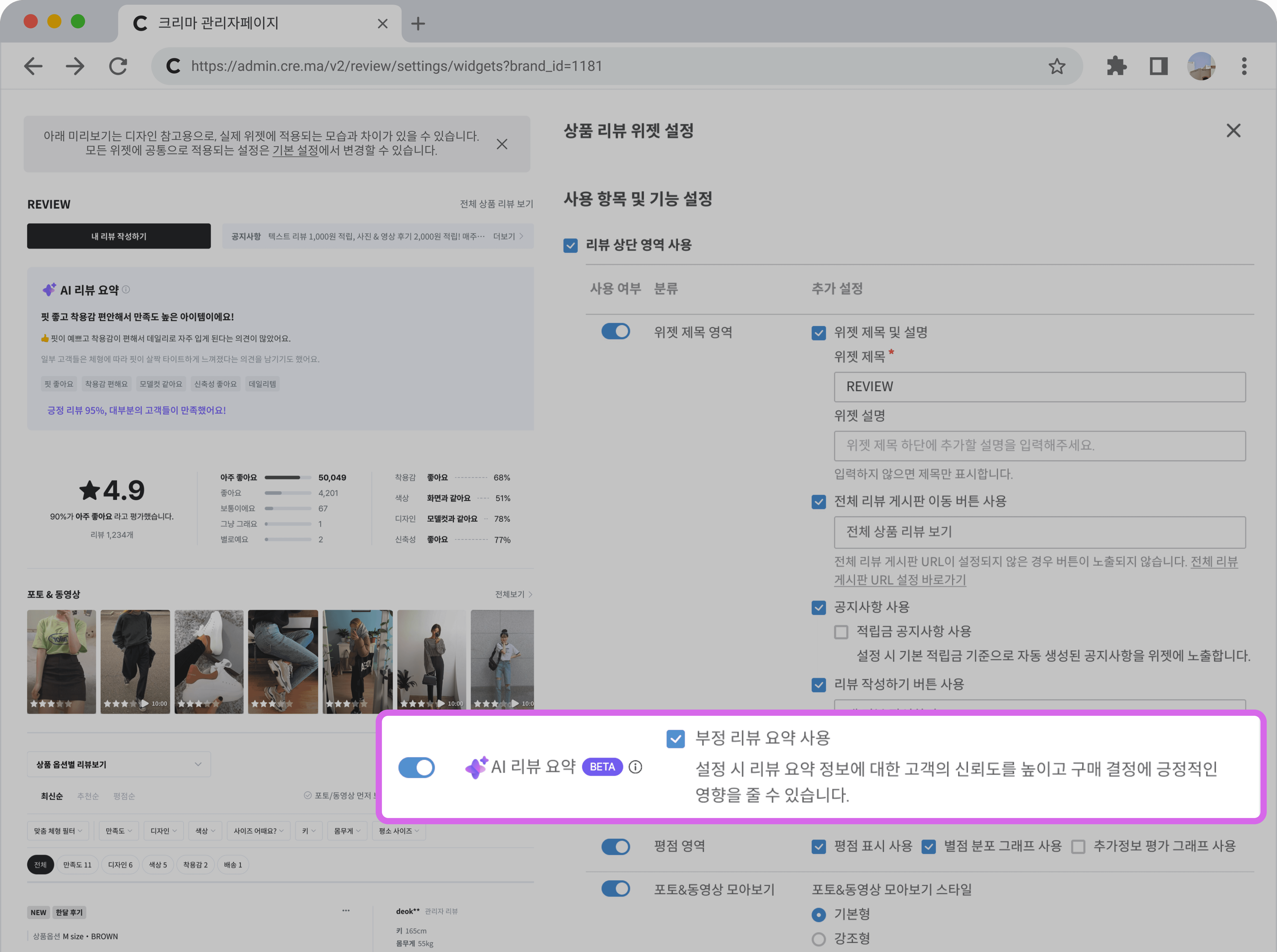 AI 리뷰 요약을 쇼핑몰에 노출하려면 크리마 관리자 페이지에서 간단한 설정만 해주시면 돼요. [관리자 페이지] → [리뷰] → [위젯 설정] → 위젯 리스트에서 리스트 스타일 위젯의 [설정] 버튼을 클릭한 뒤, 오른쪽 ‘사용 항목 및 기능 설정’ 영역에서 [AI 리뷰 요약] 토글을 켜주세요.
