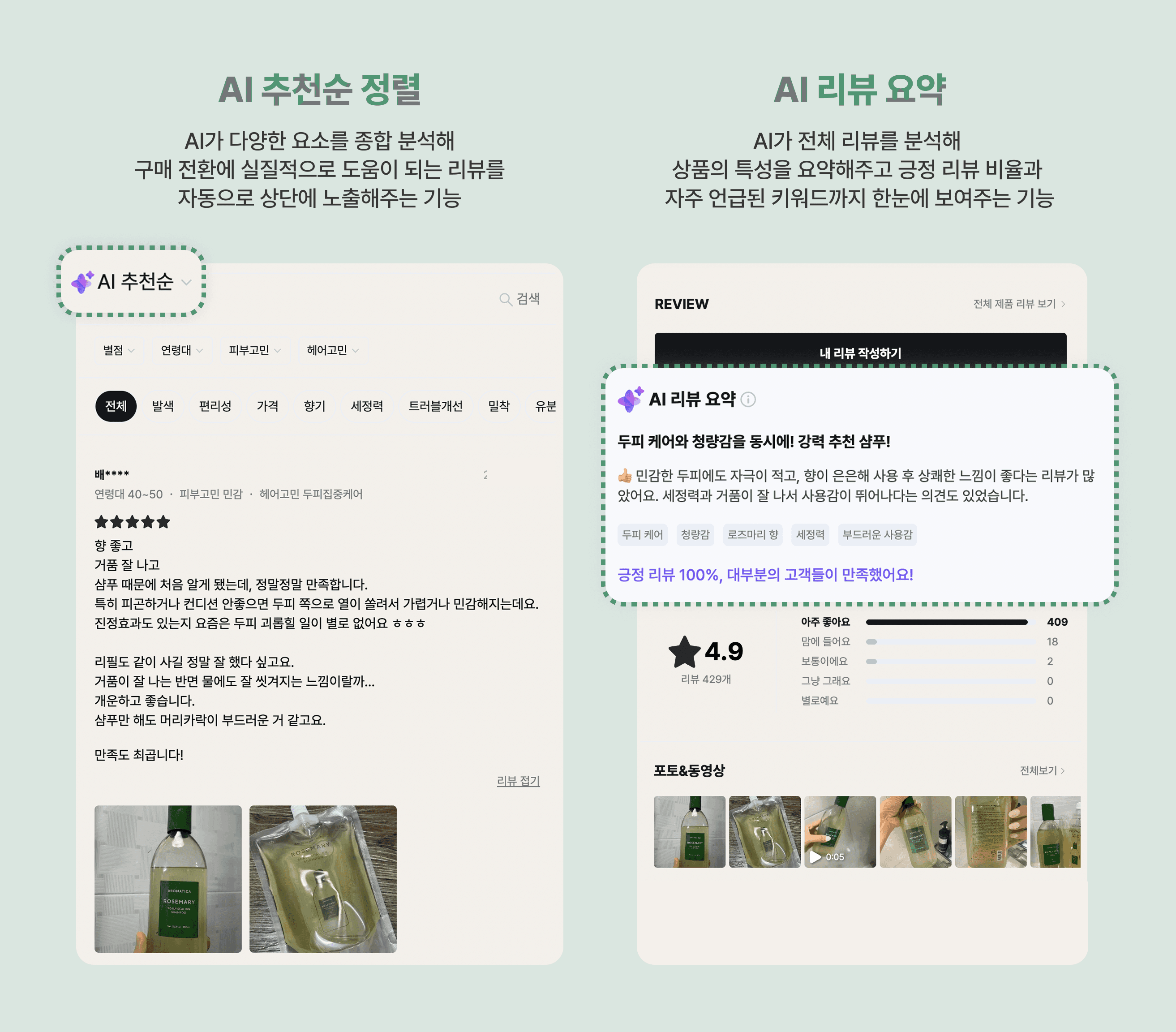 ‘AI 추천순’ 정렬은 AI가 본문 길이, 이미지/영상 포함 여부, 긍정 키워드 등 다양한 요소를 종합 분석해, 구매 전환에 실질적으로 도움이 되는 리뷰를 자동으로 상단에 노출해주는 기능이에요.