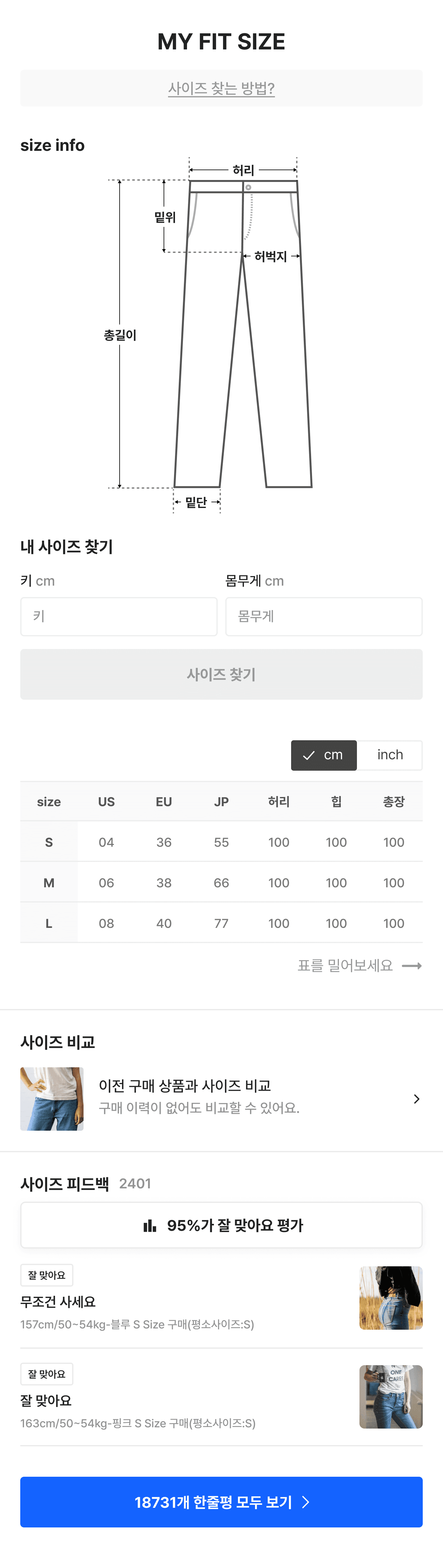 실측 사이즈를 비교해서 구매하려는 상품의 핏을 가늠할 수 있습니다.