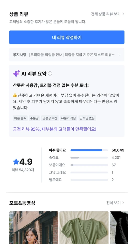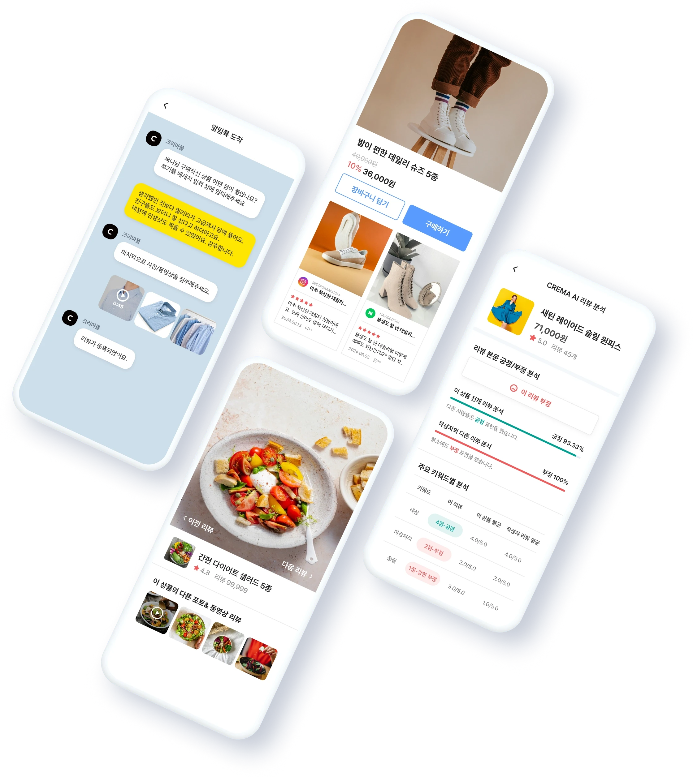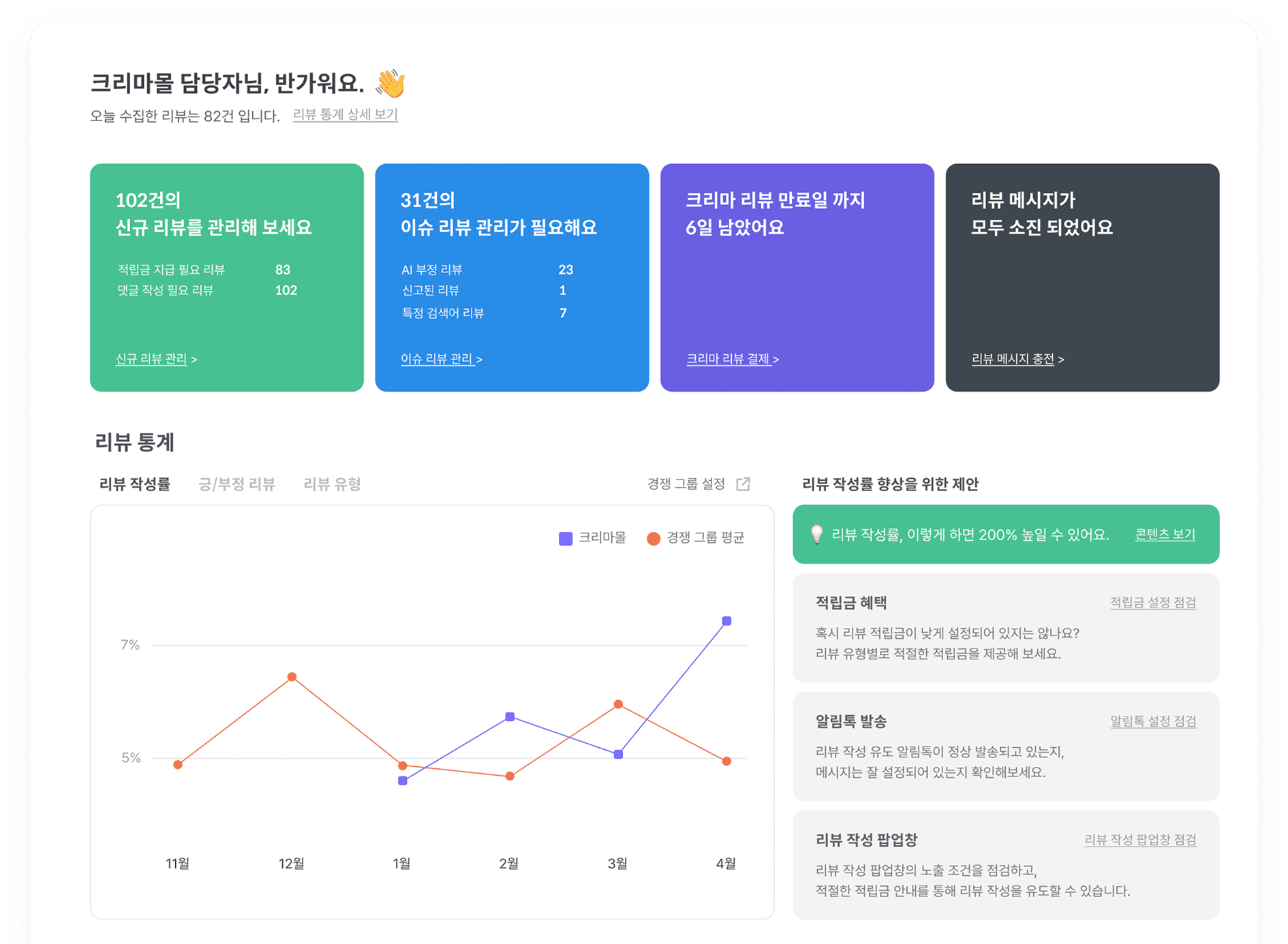 신상품 반응을 빠르게 파악해요.신상품이 자주 출시되니 자사몰 리뷰를 보며 고객들의 반응을 체크하는데요. ‘AI 리뷰 분석’으로 상품에 대한 고객의 피드백을 빠르게 파악하고 있습니다. 또한, 크리마 리뷰를 도입하고 세트 상품 리뷰 연동이 편해지고 동영상 리뷰도 눈에 띄게 늘어 매우 만족합니다.